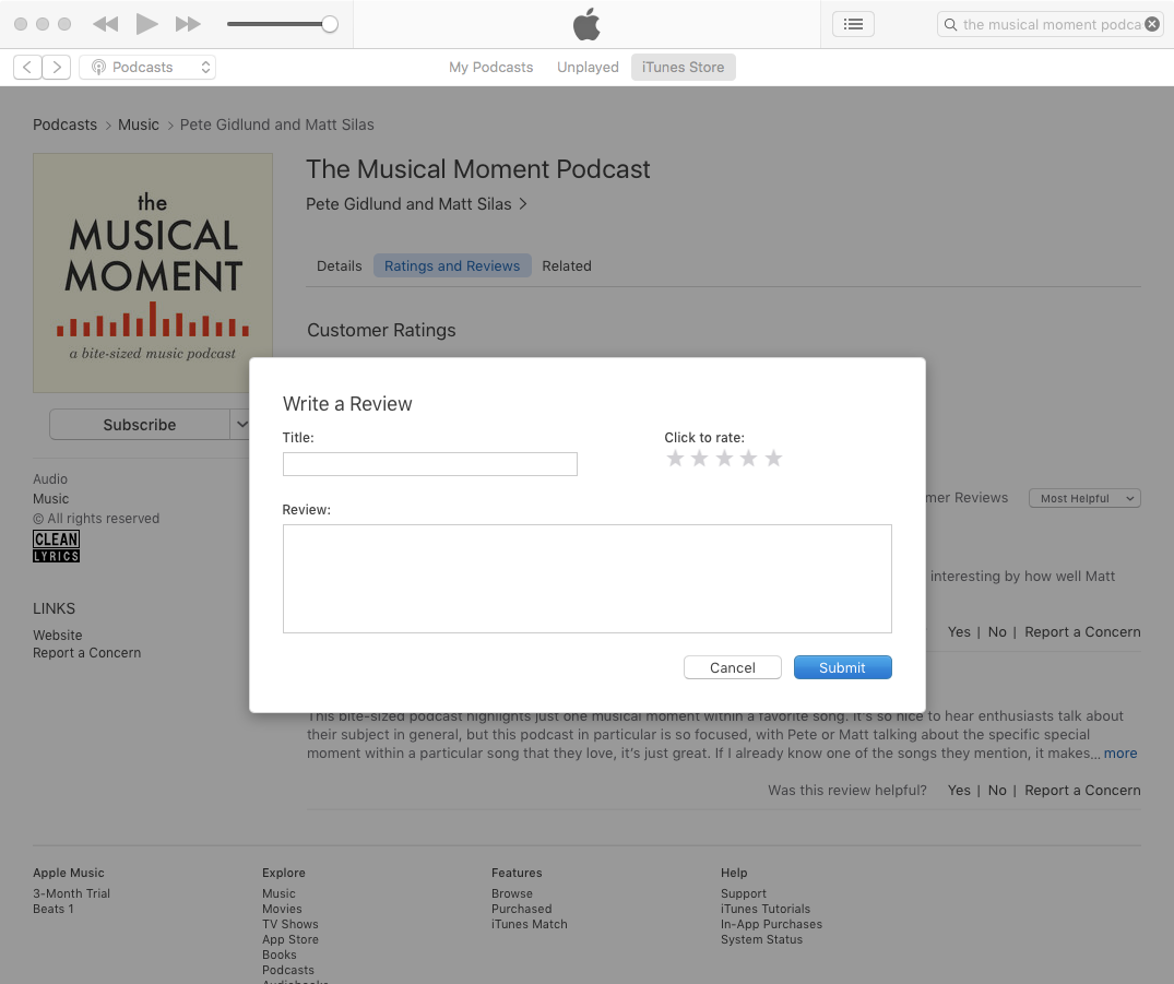 You've done it! Rate us with stars, write a title, and tell the world why you like our show. Be sure to hit "Submit" when you're all done.